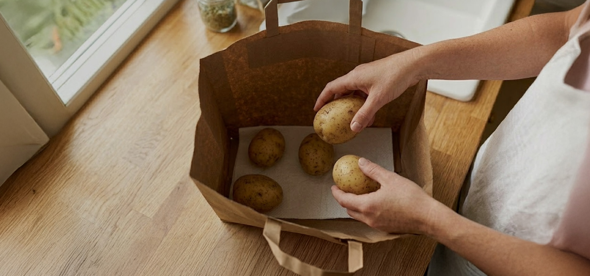 크라프트지로 된 쇼핑백은 통풍이 잘되면서 빛을 차단해 감자 보관에 매우 좋습니다. 집에 있는 쇼핑백에 키친타올을 1장 깔아주세요. 키친타올은 수분을 흡수해 감자가 무르는 것을 막아줍니다.