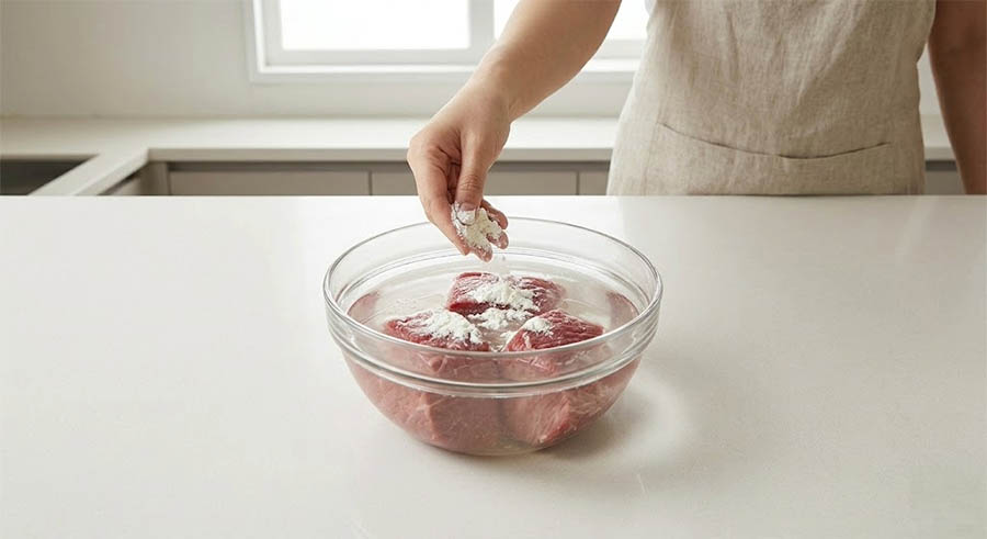 ➊ 고기를 물에 담그고 밀가루 뿌려 5분 두기