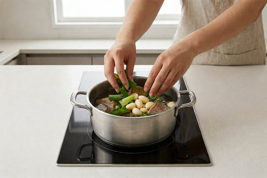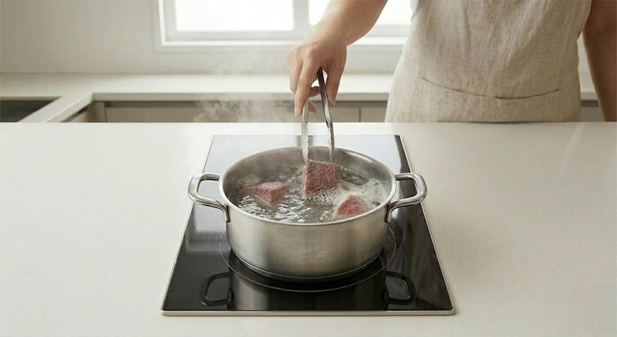 끓는 물에 고기를 넣고 10분 동안 삶아주세요. 초벌로 삶는 과정에서 고기에 남아 있는 핏물과 불순물이 빠지면서 잡내가 크게 줄어듭니다.