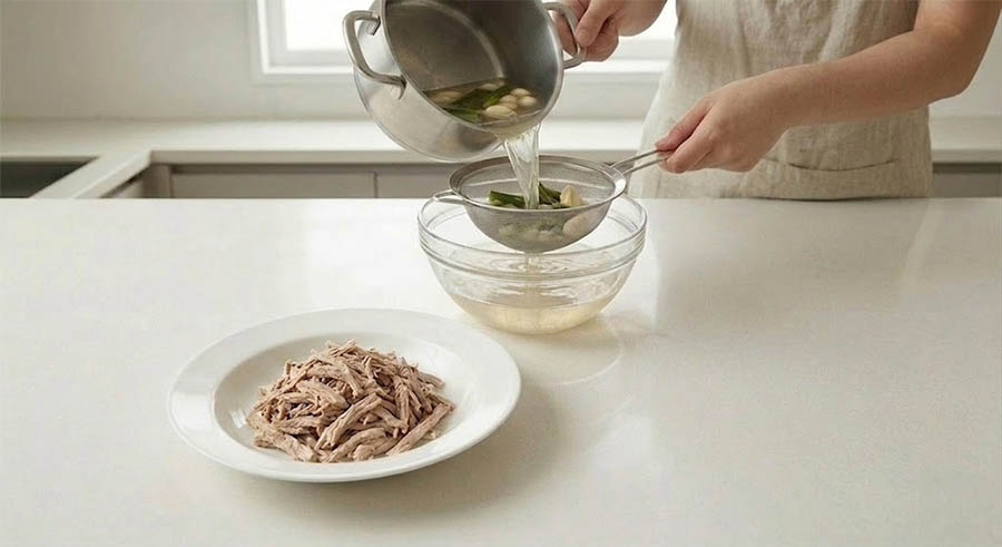 고기를 건져낸 후, 냄비에 남은 육수는 체에 밭쳐 거른 뒤 보관해 주세요. 삶은 고기는 잘게 찢어주세요.