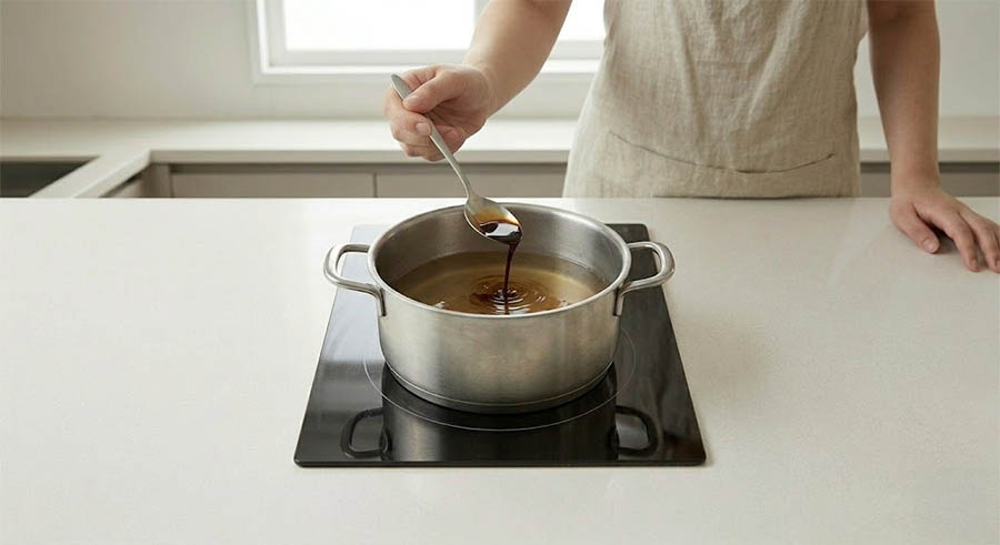 ➎ 육수에 양조간장, 미림, 흰설탕, 흑설탕을 넣어 끓이기