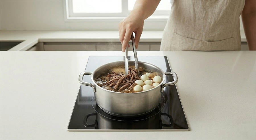 ➏ 고기와 메추리알을 넣고 10분 끓이기